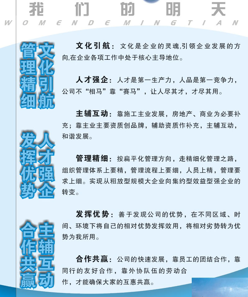 4、企業(yè)文化是企業(yè)發(fā)展戰(zhàn)略規(guī)劃的重要組成部分,公司的發(fā)展戰(zhàn)略是:文化引航、人力強企、主輔互動、精細管理、發(fā)揮優(yōu)勢、合作共贏。