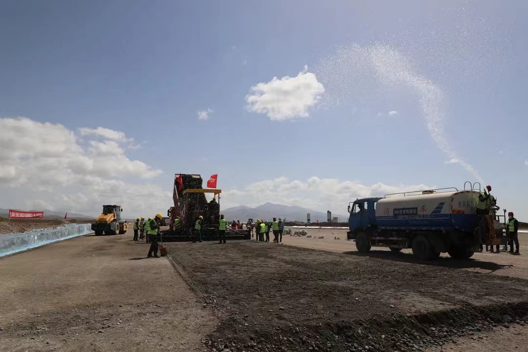 5月28日,伴隨著第一車(chē)水泥穩(wěn)定砂礫混合料緩緩倒入攤鋪機(jī)料斗,標(biāo)志著由我司承建的新疆和靜(巴音布魯克)機(jī)場(chǎng)飛行區(qū)跑道水穩(wěn)基層試驗(yàn)段施工正式拉開(kāi)序幕。