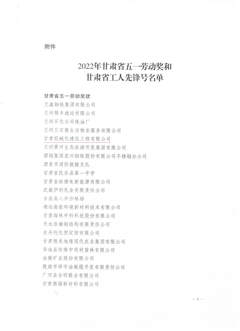 近日,甘肅省總工會發(fā)布了《關(guān)于表彰2022年甘肅省五一勞動獎和甘肅省工人先鋒號的決定》,我司被授予“甘肅省五一勞動獎”和“甘肅省工人先鋒號”。