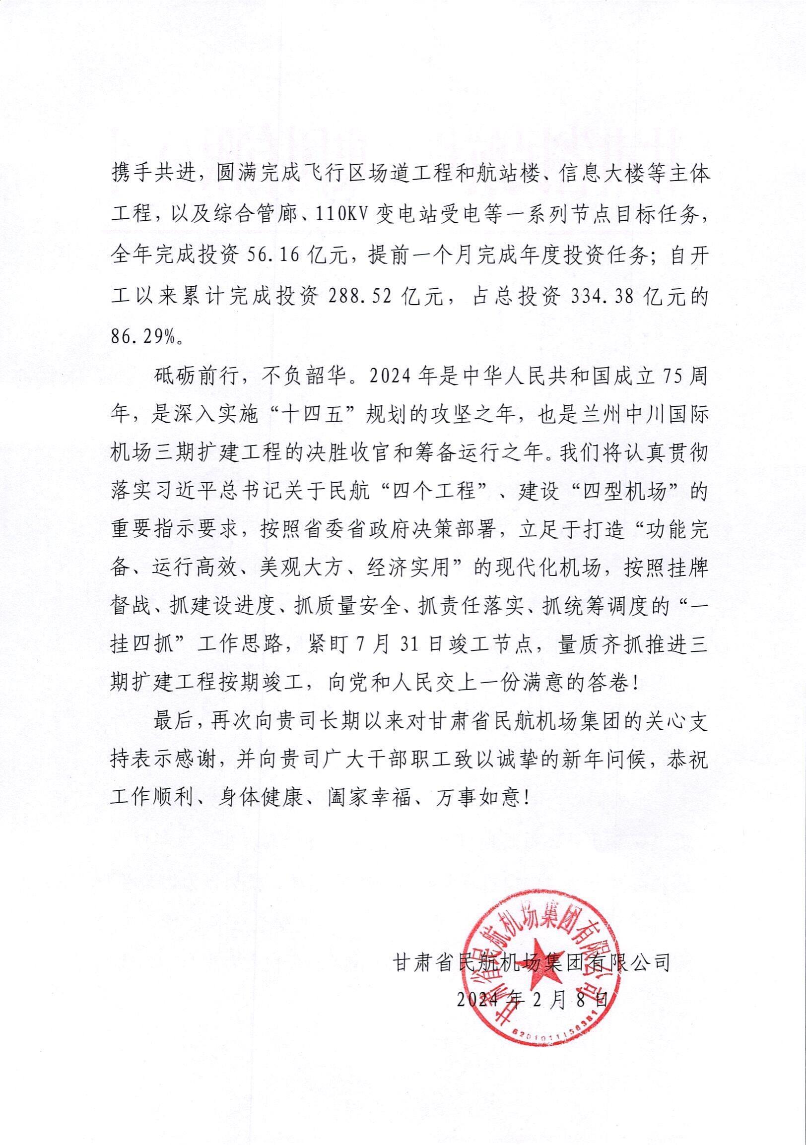 最后,甘肅省民航機場集團有限公司再次向我司長期以來對甘肅省民航機場集團的關(guān)心支持表示感謝,并向我司廣大干部職工致以誠摯的新年問候!